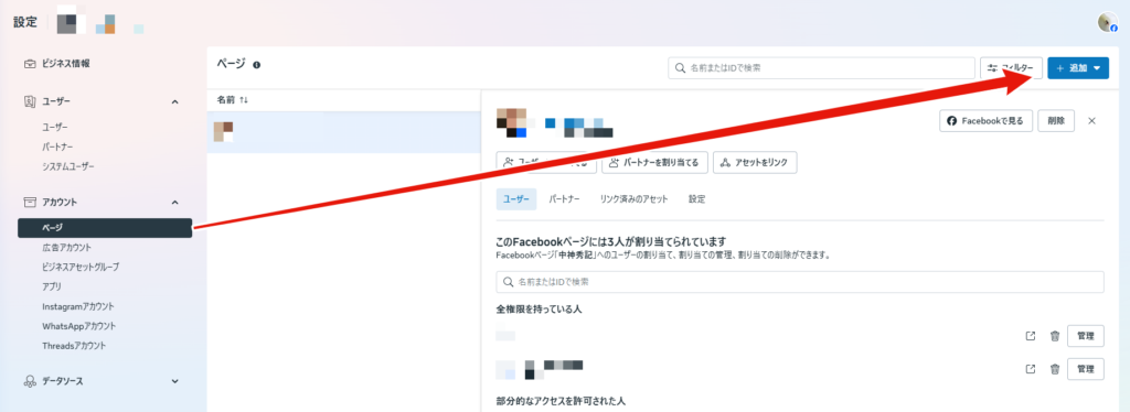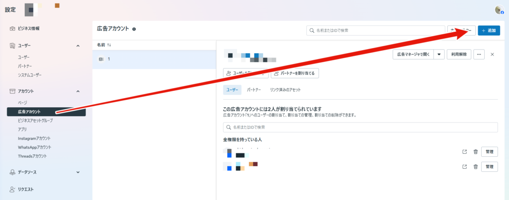 - ビジネスマネージャーのサイドバーから「広告アカウント」を選択し、「追加」ボタンをクリックします 。