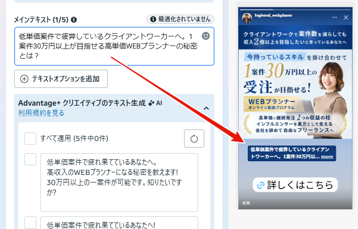 Meta広告で成果を出すためには、目を引く画像や動画を作成するだけでなく、ユーザーの行動を後押しするメインテキストと見出しの設計が必要不可欠です。