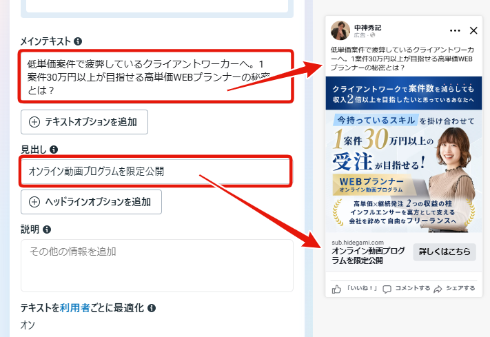 Meta広告を構成するテキスト要素の中で、最もユーザーの目に入るのが「メインテキスト」と「見出し」です。