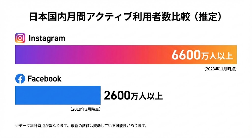 2023年11月時点でInstagramの日本国内の利用者は6600万人以上、2019年3月時点でFacebookは2600万人以上もいると言われています。
