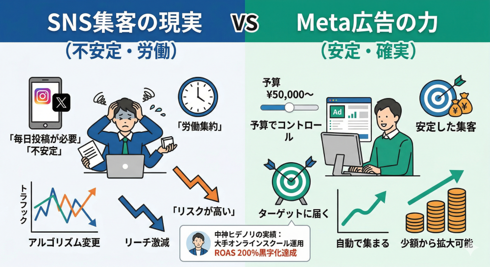 毎日コンテンツを作り続けても、プラットフォームの都合ひとつで集客が止まる。これが労働集約的なSNS集客の本質的なリスクです。
