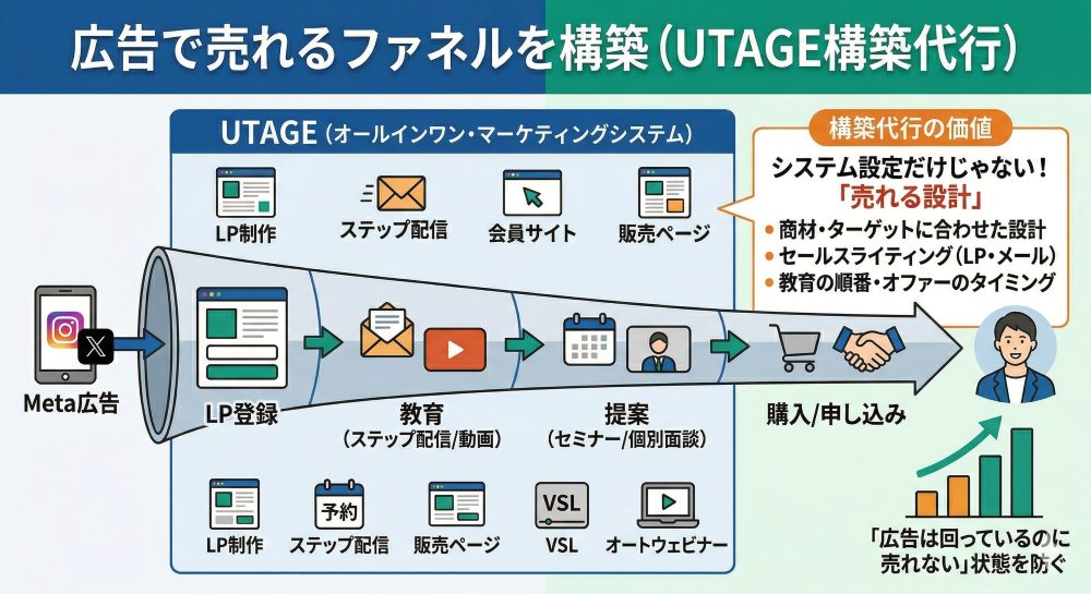 UTAGE構築代行×Meta広告運用代行のサービスは、集客から販売までの仕組みをまるごと構築・運用代行するサービスです。
