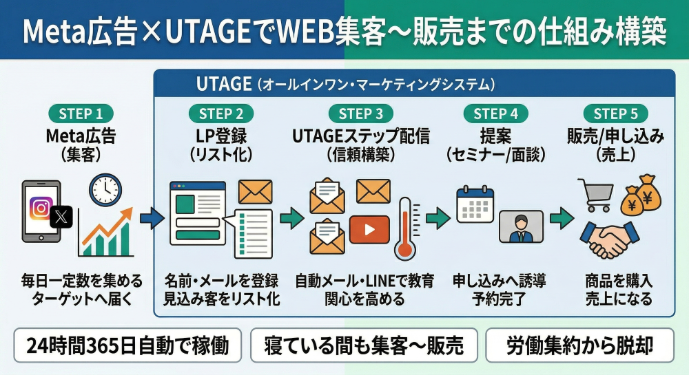 UTAGE構築代行×Meta広告運用代行で仕組みが完成すると、集客から販売までの流れが自動化されます。