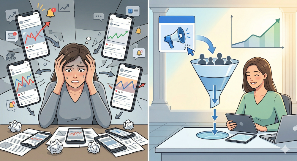 毎日のSNS投稿、ストーリーズの更新、フォロワーへのDM返信、ライブ配信の準備。気づいたら一日の大半が、集客作業で終わっている。
